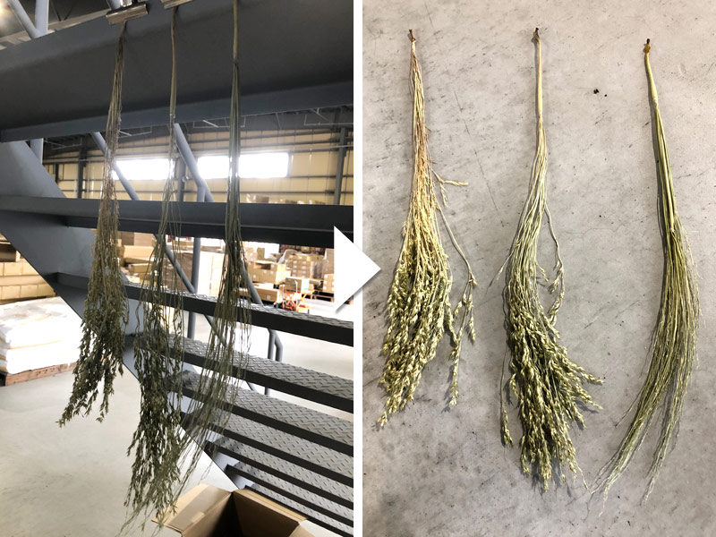 まだ種がしっかりと膨らむ前の状態だったため、脱穀することも難しく、捨ててしまうのももったいないという思いから、種がついた状態で陰干しをしていました。